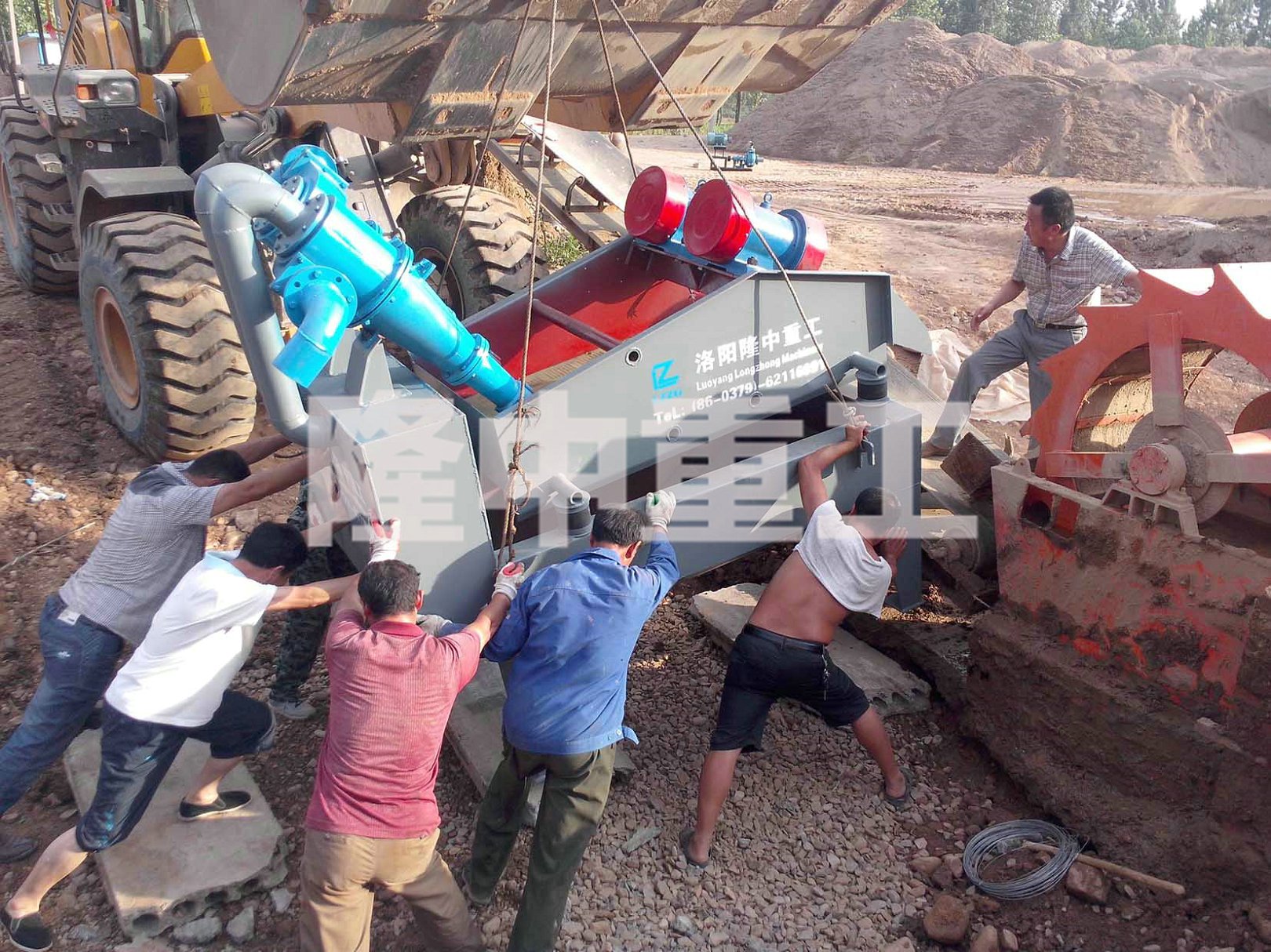 細砂回收機設備運到現場后正在進行安裝工作。細砂回收機雖然也不是什么很大的設備,但仍然較重,因此在安裝的過程中需要使用工程機械的輔助,通常情況下各砂石廠都有大型鏟車使